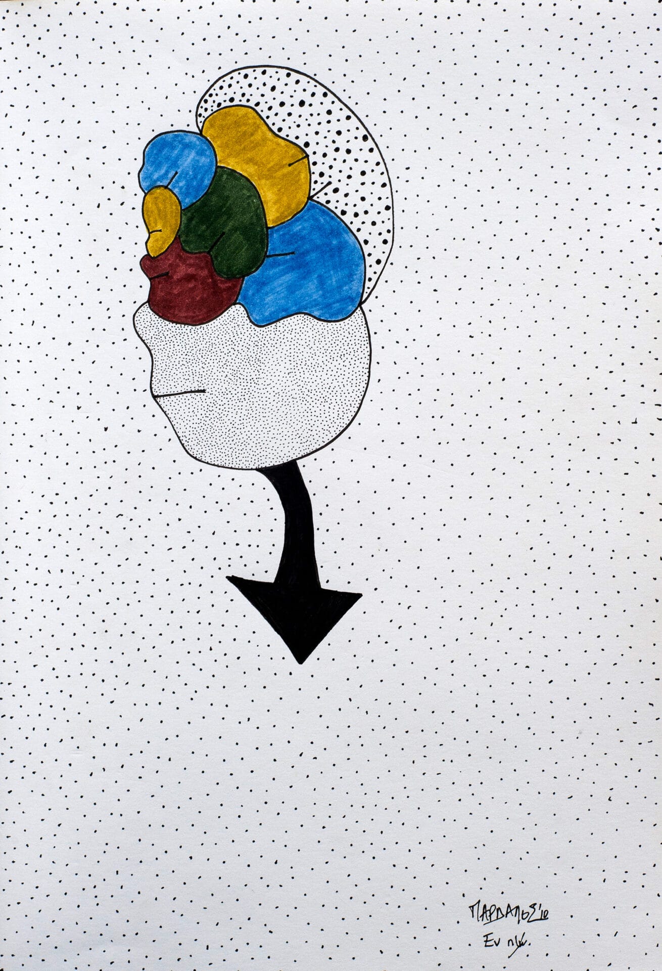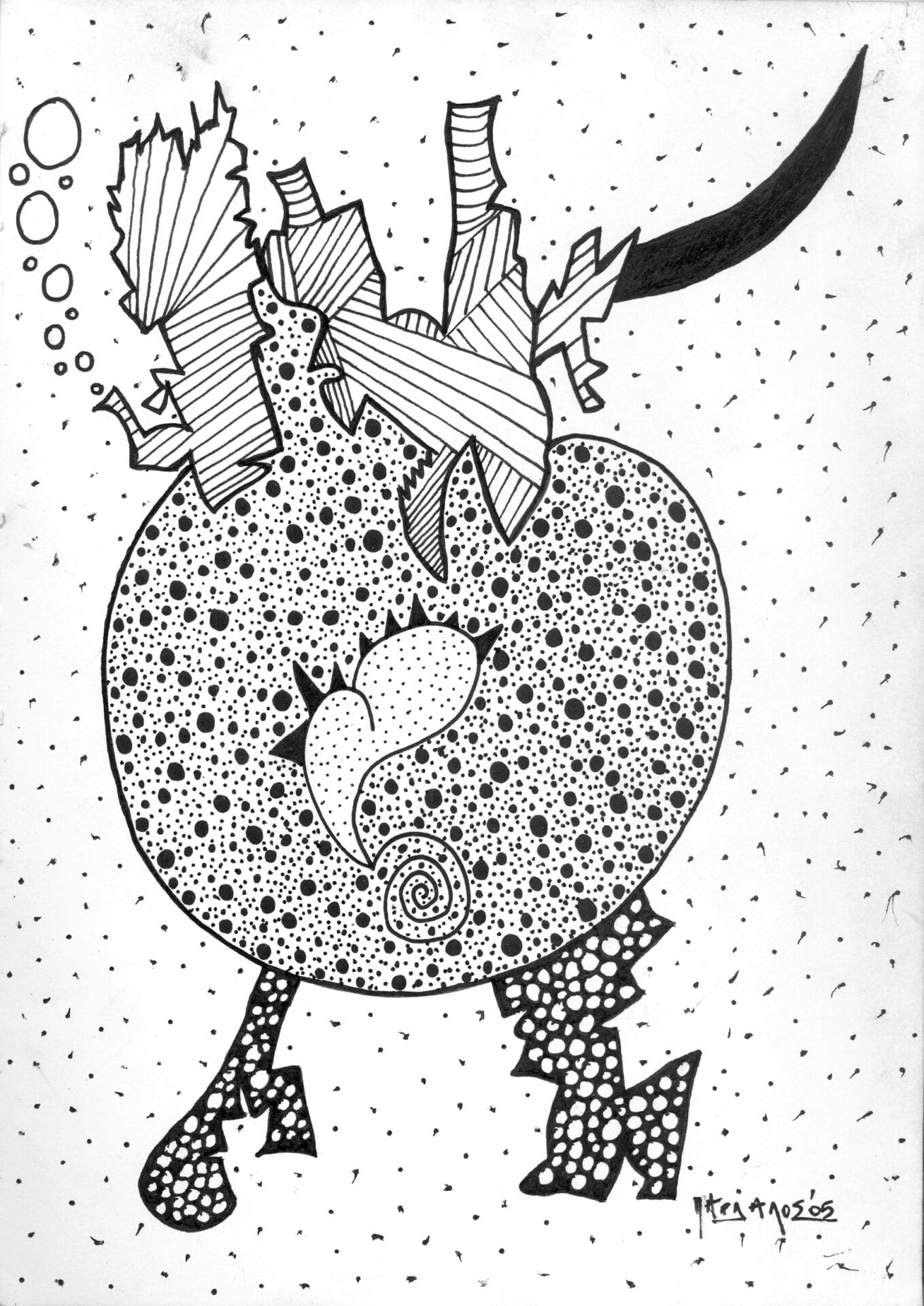 Automatic writing is the method the artist uses to produce his visual outcomes, drawing from the practices of the Dadaists and Surrealists. At the same time, there is a clear reference to the psychedelic art of the 1960s. Morphologically, his work preserves the freedom to swing like an artistic pendulum between figuration and abstraction.
