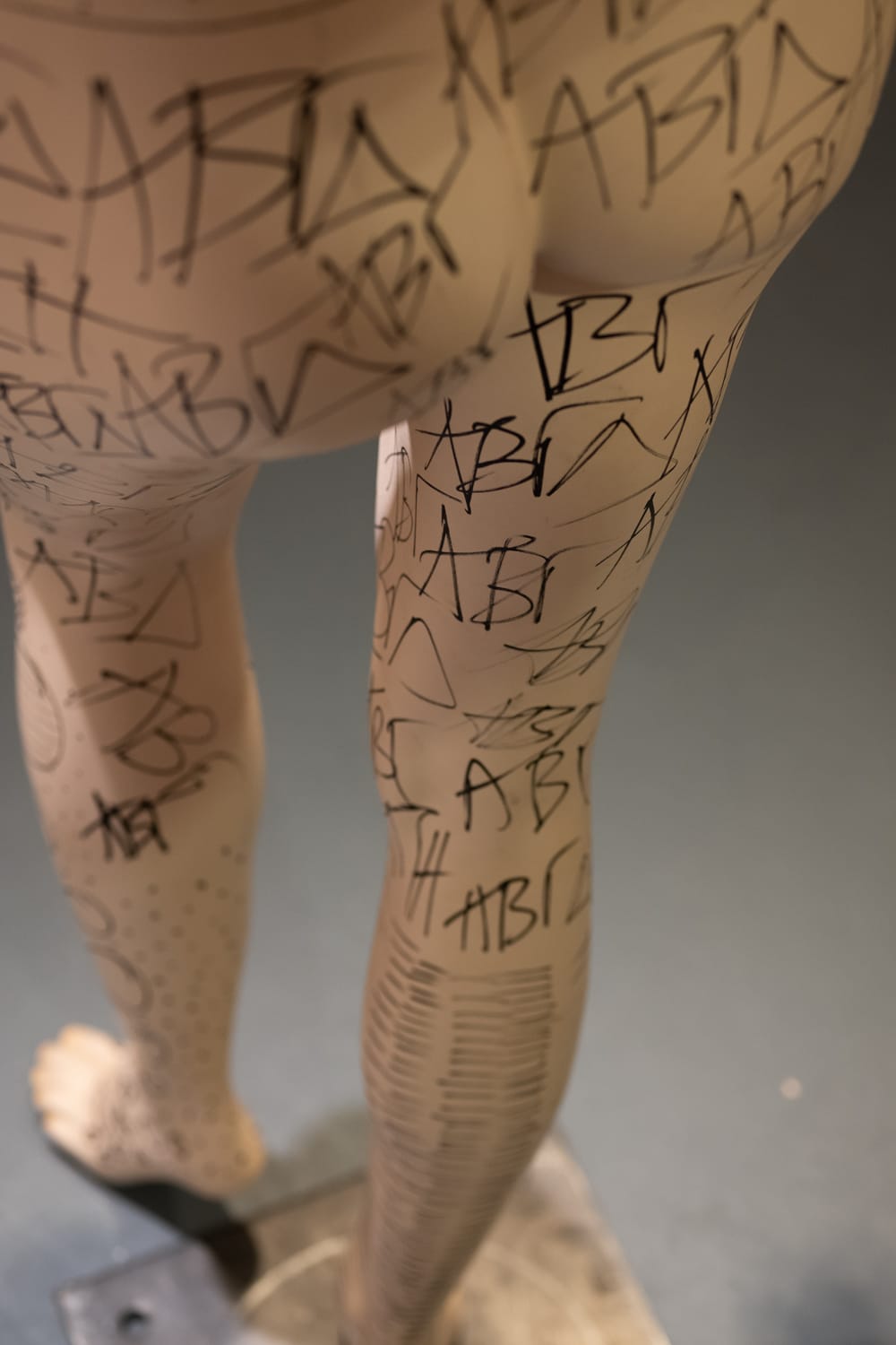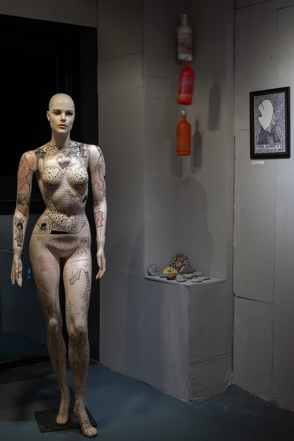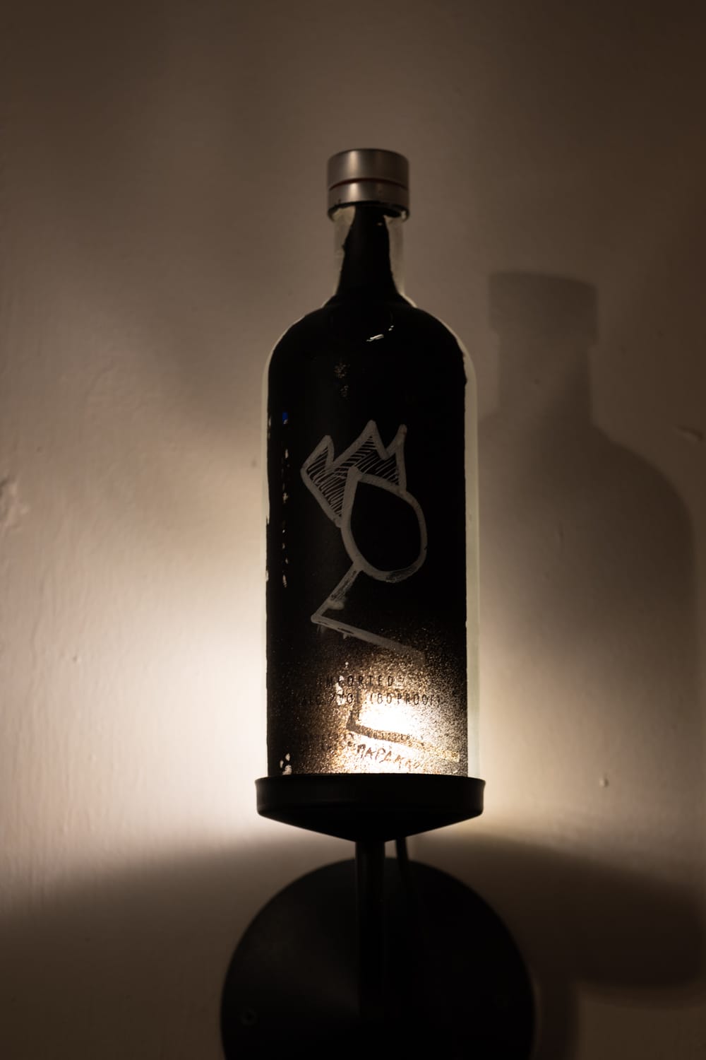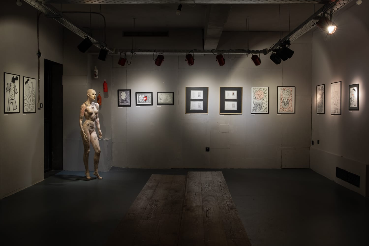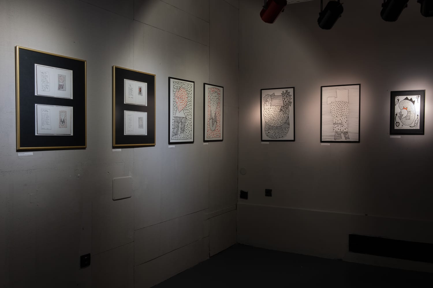The dot becomes the starting point for a new drawing adventure, completed through free association. The notebook is the “place” where everything begins, while the objets trouvés elevate the personal to the political by appropriating everyday objects such as empty vodka bottles, store mannequins, and even stones from beaches.